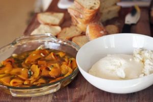 BRUSCHETTA WITH HOMEMADE RICOTTA ROASTED YELLOW PEPPERS AND GREEN GARLIC