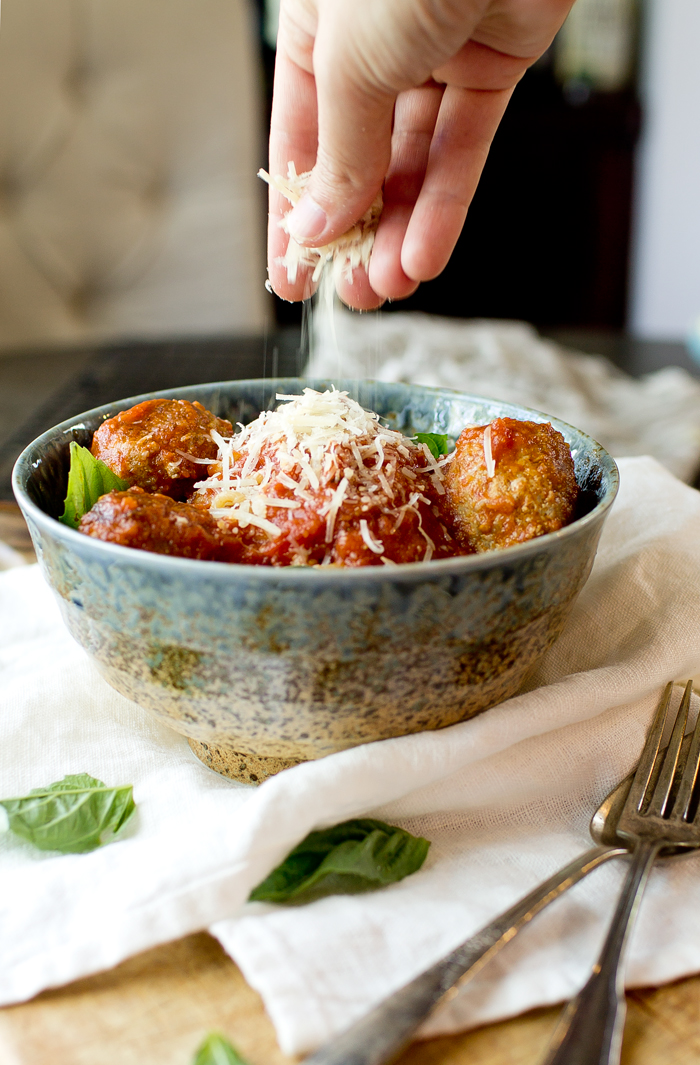 I know- I was confused about that when I first saw this recipe too. But fear not, there is still tons of flavor in the form of 12 garlic cloves. You don’t miss the onion, and in fact this recipe made me wonder why we automatically assume that there needs to be onion in marinara..? Isn’t it all about pure, unadulterated, tomato-y bliss..?SM4 Moving onto the meatballs- this is a pretty classic Italian meatball recipe. No extra fancy bells and whistles, just a trio of the 3 perfect meats (beef, pork, and veal), combined with moistened breadcrumbs, egg, cheese, and a little garlic.