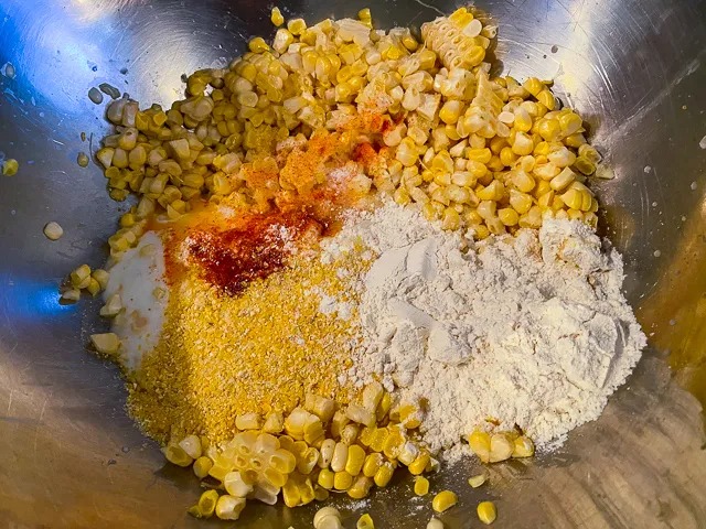 This is a dangerous corn fritter recipe in that the corn is barely held together by the flour and wet ingredients. You’ve got some cornmeal, some flour, some spices, a little milk (I used buttermilk), and an egg, and then tons of fresh, sweet summer corn.