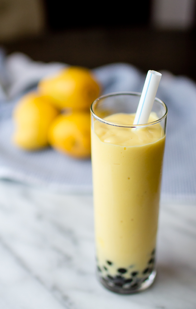 If you happen to have never heard of boba before, it’s a type of drink that originated in Taiwan and can be anything from a milky tea drink to a fruit smoothie. The common denominator between the drinks is the tapioca “boba” which are round, gummy, and occasionally fruit flavored spheres that you suck up with a wide-bore straw and which create a very interesting textural drinking experience.Mango Smoothie with Boba- thegourmetgourmand.comTaro milk tea boba with black tapioca has always been my standard drink of choice, but the fruitier teas are always welcome and the popping boba are always an interesting and fun taste adventure.