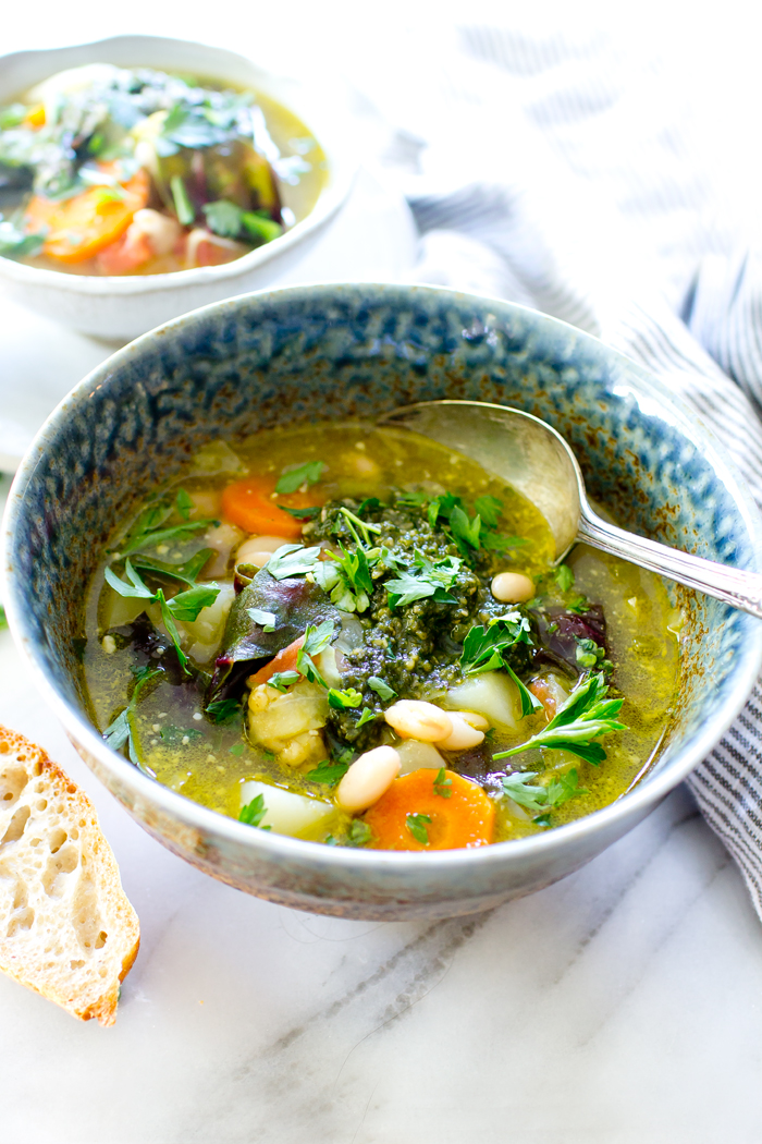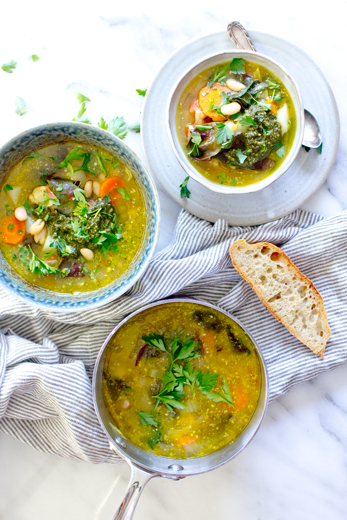 But regardless of what vegetables you use, the whole thing is brought together with fresh basil pesto. I’m serious. The broth literally has pesto stirred right in (and dolloped on top for extra measure). Pesto = the best of the green flavors, am I right?
