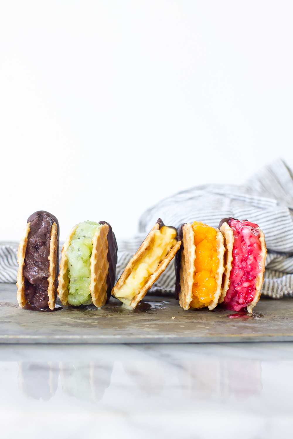 Anyway, hope these little treats make their way to your freezer this summer. Or, fall, or winter, or spring… really whenever the craving for an assortment of rainbow sorbet sandwiches hits.