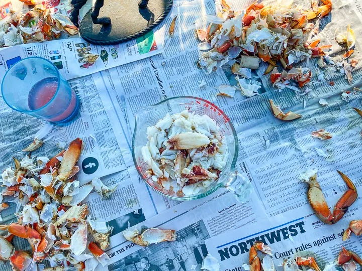 We helped Craig’s dad carry his boat to the beach, set up a motor, and then he pulled up the crab traps that he dropped the day before with turkey legs to lure in the highly prized Dungeness crabs. Back on shore, we boiled the crabs in sea water and then picked them apart at a table while drinking rosé.